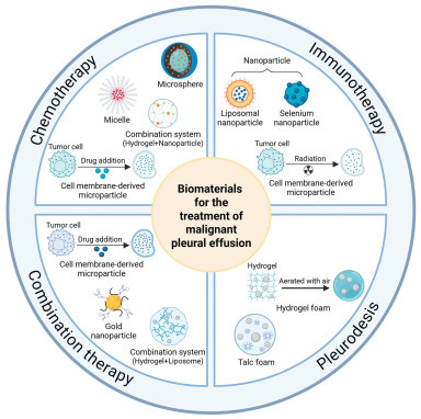 Intrathoracic chemotherapy not only reduces pleural effusion but also enhances systemic antitumor effects. Currently, the approved intrathoracic antitumor therapies include chemotherapy (platinum-based drugs) and antiangiogenic treatments (recombinant human endostatin and BEV) [11]. Clinical guidelines recommend draining pleural effusion before initiating systemic chemotherapy. An experiment by Herrstedt et al. demonstrated that compared with patients without MPE, patients with small cell lung cancer (SCLC) and MPE have increased myelosuppression after treatment, possibly due to the accumulation of chemotherapy drugs in pleural effusion, which exacerbates toxicity [46]. In addition to conventional chemotherapy, hyperthermic intrathoracic chemotherapy (HITHOC) is also used in clinical practice. HITHOC directly exposes tumor cells to higher concentrations of chemotherapy drugs, reduces systemic side effects, and improves the survival rate of patients compared with those who do not receive it [47]. Unfortunately, the chemotherapy methods currently used in clinical practice still have significant limitations and fail to achieve the desired outcomes. To improve chemotherapy efficacy and address certain limitations, this review discusses the use of biomaterial-based chemotherapy drugs for the treatment of MPE, with a focus on microspheres, cell membrane-derived microparticles (MPs), micelles, biodegradable drug-eluting pellets, and some composite systems.