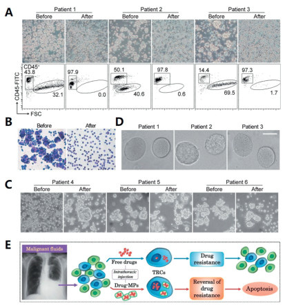 Figure 2 (A) Comparison of MPE fluids after one-week treatment with CisMPs (magnification: 200×). (B) Cytologic analysis of pleural effusion in the CisMPs group (magnification: 200×). (C) Observation of MPE in the cisplatin group (magnification: 200×). (D) Formation of spheroids from primary tumor cells. Scale bar: 50 µm. (E) Differences between drug-MPs and free drugs. Copied with permission [56]. Copyright 2016, Springer Nature.