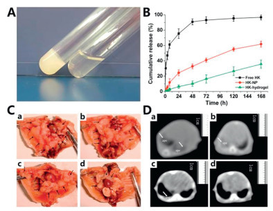 Figure 3 (A) Images of HK hydrogels at various temperatures. (B) Results of the in vitro release experiment. (C) Malignant pleural neoplasms in mice following intrapleural injection. (a) NS group; (b) hydrogel group; (c) HK group; (d) HK−hydrogel group. (D) Computed tomography (CT) imaging of MPE in mice after intrapleural administration. (a) NS group; (b) hydrogel group; (c) HK group; (d) HK−hydrogel group. Copied with permission [64]. Copyright 2009, American Chemical Society.