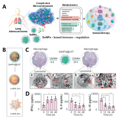 Figure 4 (A) Strategic design of nanotherapeutics. (B) Morphological and structural changes in SeNPs@LNT in MPE. (C) SeNPs@LNT uptake by macrophages. (a) TEM examination for 4 h. (a') Uptake and accumulation of SeNPs@LNT. (b) TEM examination for 24 h. (b') Uptake and accumulation of SeNPs@LNT. (D) The levels of IFN-γ, IL-6 and IL-10 in MPE. Copied with permission [73]. Copyright 2021, John Wiley and Sons.