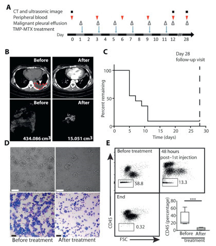 Figure 5 (A) ATMP-MTX treatment and biomarker assessment schedule. (B) Comparison of pre- and post-treatment chest CT images in a patient. (C) Kaplan-Meier curve of pleurodesis success in all 11 patients. (D) Comparison of pre- and post-treatment light microscope examination of MPE cells from a patient. Scale bar: 100 µm. (E) Comparison of proportions of CD45− cells in MPE samples before and after ATMP-MTX treatment. Copied with permission [88]. Copyright 2019, The American Association for the Advancement of Science.