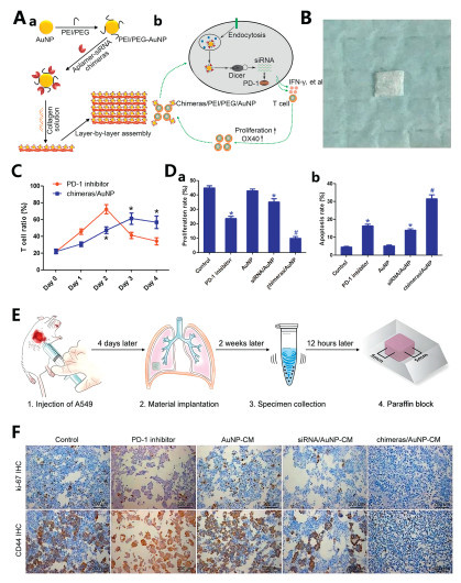 Figure 6 (A) Construction of aptamer-siRNA chimeras/PEI/PEG/AuNP/collagen membrane. (a) Schematic diagram. (b) Activation of T cells. (B) General picture of chimera/AuNP membrane. (C) PD-1 inhibitor group and the chimeras/AuNP group activate T cells. (D) Lymphocytes were co-cultured with lung adenocarcinoma cells after treatment for 96 h. (a) Proliferation rate. (b) Apoptosis rate. (E) Flow chart of animal experiments. (F) Expression of Ki-67 and CD44 in immunohistochemistry. Reproduced with permission [96]. Copyright 2022, Frontiers.