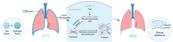 Figure 7. Schematic illustration of biomaterial modified talc for pleurodesis for the therapy of MPE. Mesothelial cells exposed to biomaterial-modified talc initiate an inflammatory cascade by secreting mediators, recruiting and proliferating fibroblasts, inducing nonspecific organizing fibrinous pleuritis, ultimately leading to pleural fibrosis.Baxter et al. developed a liquid foam formulation comprising 25% by weight talc combined with poly(ethylene oxide)-poly(propylene oxide)-poly(ethylene oxide) tri-block copolymer (TCH) at various concentrations [105]. When cold foam is delivered into the pleural cavity and comes into contact with the warm tissue, the liquid phase undergoes gelation, adhering to the tissue and extending the contact time between talc powder and the tissue. This enhances the formation of adhesions in the pleural space. The study utilized small amplitude oscillatory shear rheology (SAOS) to assess three formulations, talc powder, saline, and reverse triblock copolymer hydrogels (TF-15, TF-20, and TF-22.5), from the perspectives of rheology, foam stability, in vitro coating, and bioadhesive characteristics. Therapeutic effectiveness was subsequently validated through a New Zealand rabbit pleural fixation model. The sol-gel transition temperature (Tgp) was determined rheologically as 17 ℃ for TF-22.5, 26 ℃ for TF-15, and 19 ℃ for TF-20. Maintenance of foam temperature below Tgp during delivery is critical to prevent catheter occlusion, given that the liquid-state formulation must traverse delivery apparatus prior to encountering the 37 ℃ pleural environment. The temporal progression to Tgp following intrapleural administration governs coverage characteristics (Fig. 8): TF-15 had a prolonged gelation time, with strong fluidity prior to gelation, leading to uneven foam coverage. TF-22.5 exhibited the fastest gelation but failed to fully cover the tissue. TF-20 demonstrated an effective balance, forming a coating and gel within the pleural cavity, leading to more uniform talc deposition and increased pleural adhesion. TF-20 shows promising clinical potential, with minimal side effects observed, in addition to a transient decrease in heart rate in the rabbits. On the basis of these findings, subsequent investigations employing larger animal models with pleural physiology more closely approximating human anatomy should be expected to become the focus of future clinical research.