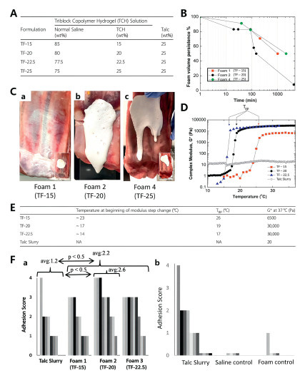 Figure 8 (A) Composition of the formulations TF-15, TF-20, TF-22.5, and TF-25. (B) In vitro experiment of foam persistence. (C) Ex vivo vertical flow test on porcine chest walls. (a–c) Test results of TF-15, TF-20, and TF-22.5. (D) Temperature-dependent material properties of the formulations. (E) Summary of the important parameters. (F) The degree of adhesions formed after 28 days in a rabbit model. (a, b) Analysis of adhesion scores. Copied with permission [105]. Copyright 2020, Springer Nature.