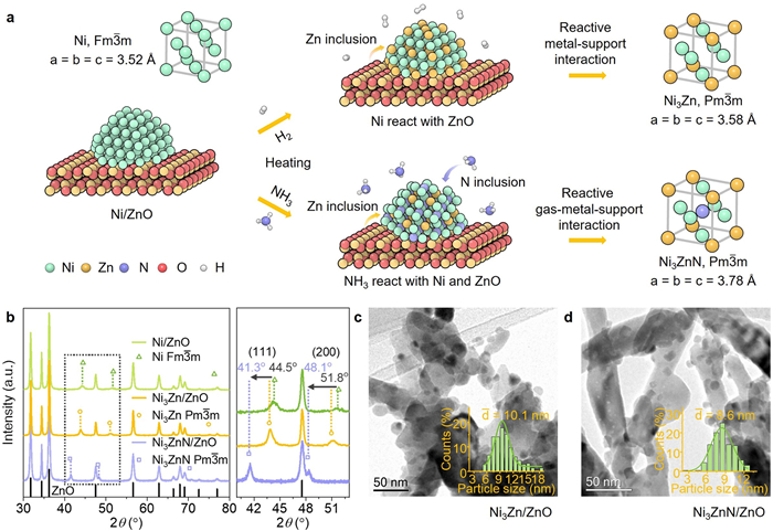 Figure 1.  (a) Schematic illustration of the synthesis approaches for Ni3Zn/ZnO and Ni3ZnN/ZnO catalysts via RMSI and RGMSI, respectively. (b) XRD patterns of Ni/ZnO, Ni3Zn/ZnO, and Ni3ZnN/ZnO catalysts. (c, d) TEM images of the synthesized Ni3Zn/ZnO and Ni3ZnN/ZnO catalysts, respectively, with insets showing the PSD histograms of the Ni3Zn and Ni3ZnN NPs.