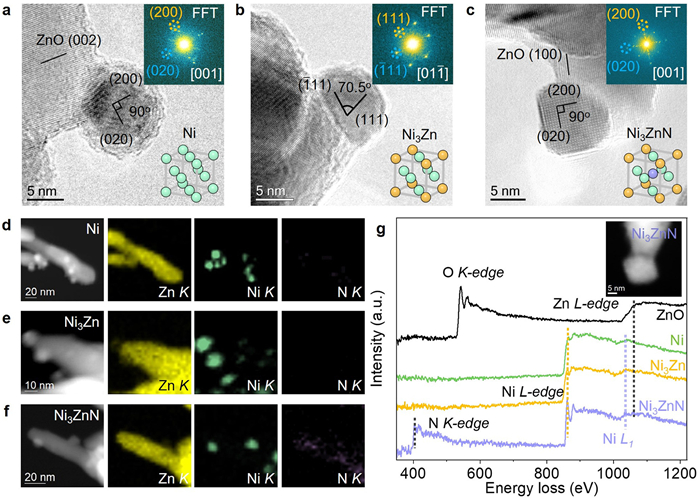 Figure 2  HRTEM images of the representative Ni (a), Ni3Zn (b), and Ni3ZnN (c) NPs. The insets show the corresponding FFT patterns (top-right) and schematic unit cell structures (bottom-right) for Ni, Ni3Zn, and Ni3ZnN, respectively. HAADF-STEM images and corresponding EDX elemental maps of Ni/ZnO (d), Ni3Zn/ZnO (e), and Ni3ZnN/ZnO (f) catalysts, respectively. The yellow, green, and purple colors represent the Ni, Zn, and N elements, respectively. (g) The EELS spectra of Ni, Ni3Zn, Ni3ZnN, and ZnO, and the inset shows the STEM image of the selected region in Ni3ZnN/ZnO.