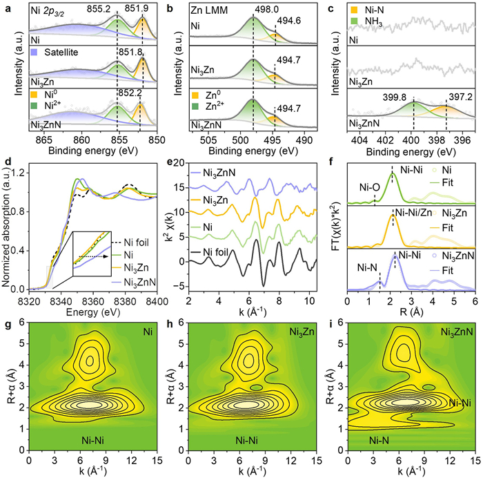 Figure 3.  XPS spectra of Ni 2p (a), Zn LMM (b), and N 1s (c) regions for Ni, Ni3Zn, and Ni3ZnN catalysts. (d) Normalized Ni K-edge XANES spectra of Ni foil, Ni, Ni3Zn, and Ni3ZnN catalysts. (e) EXAFS oscillation functions at the Ni K-edge of Ni foil, Ni, Ni3Zn, and Ni3ZnN catalysts. (f) k2-weighted Fourier transform spectra of EXAFS for Ni, Ni3Zn, and Ni3ZnN catalysts at the Ni K-edge. Wavelet transform (WT) contour plots of EXAFS spectra for Ni (g), Ni3Zn (h), and Ni3ZnN (i) catalysts.