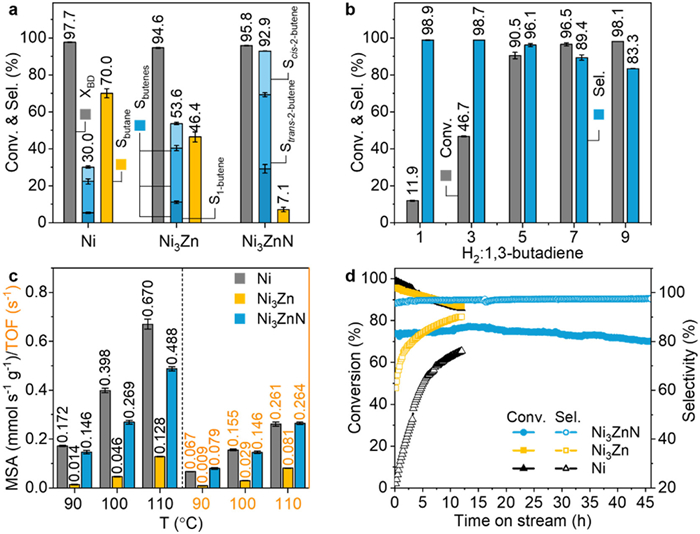 Figure 4.  (a) Product selectivity of Ni, Ni3Zn, and Ni3ZnN catalysts at about 95% conversion in the 1,3-butadiene hydrogenation reaction. (b) Conversion of 1,3-butadiene and selectivity toward butenes for the Ni3ZnN catalyst at different H2/1,3-butadiene ratios. (c) Mass-specific activity (MSA) and turnover frequency (TOF) at 90, 100, and 110 ℃ for various Ni-based catalysts. (d) Long-term stability comparison of Ni, Ni3Zn, and Ni3ZnN in terms of conversion and selectivity over time.