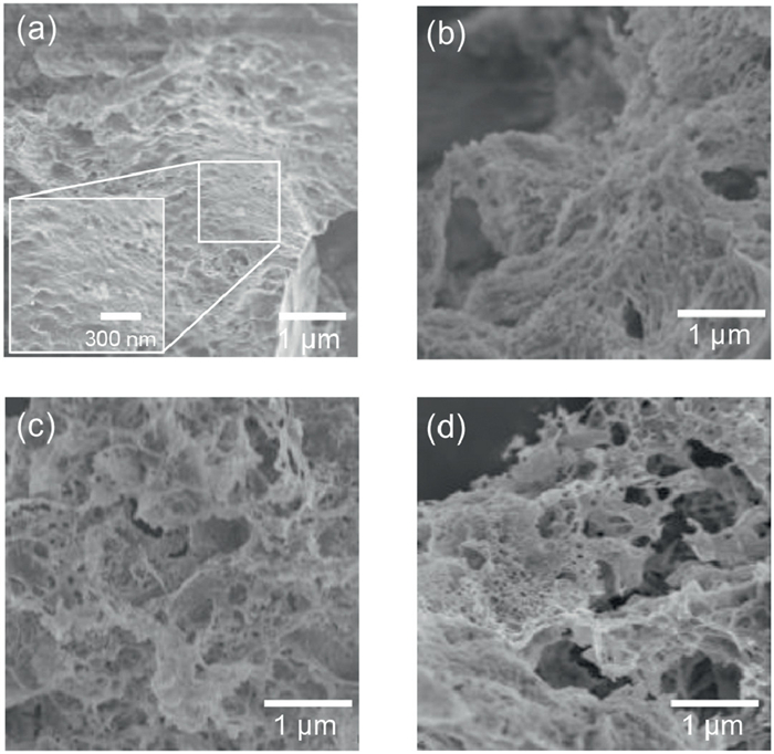 Figure 3  SEM images of SPF10 (a) (insets: partial enlarged image), SPF20 (b), SPF30 (c) and SPF40 (d) casted from the CHCl3 solutions.