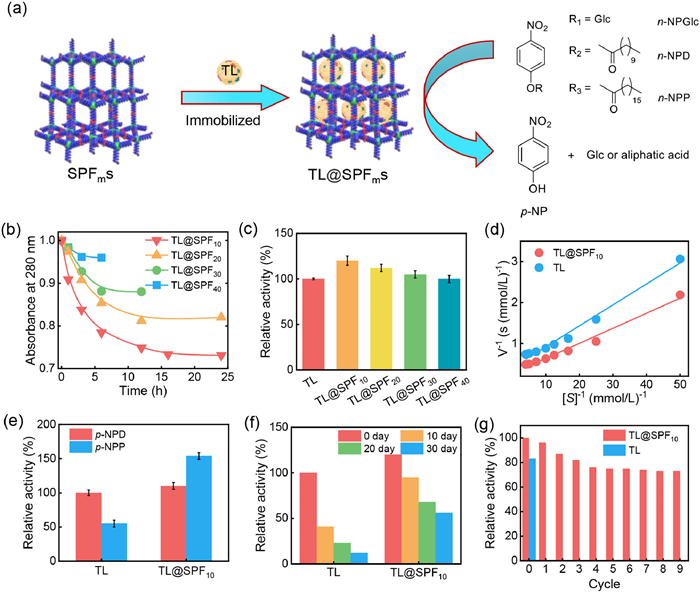 Figure 4.  (a) Schematic diagram for encapsulating enzyme into SPFms for catalysis. (b) Encapsulations of TL into SPFms with different apertures. (c) The catalytic activities of pNPGlc catalyzed by TL and TL@SPFms. (d) Lineweaver−Burk plot of n-NPGlc concentrations vs. reaction velocity for TL and TL@SPF10. (e) The relative hydrolysis activity of TL and TL@SPFms towards p-NPD and p-NPP. (f) Relative stability of TL and TL@SPF10 in storage at room temperature. (g) The catalytic cycles of pNPGlc catalyzed by TL and TL@SPFms.