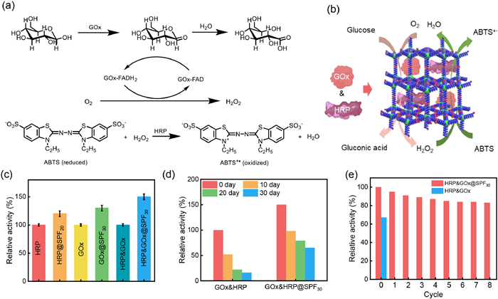 Figure 5  (a) Mechanism diagram of the catalytic activity for the cascade reactions. (b) Encapsulation of HRP and GOx into the SPFms for catalyzed glucose and ABTS cascade reaction. (c) Relative activity of HRP, GOx, HRP & GOx, and encapsulated HRP@SPF20, GOx@SPF30, and HRP & GOx@SPF30. (d) Relative stability of HRP & GOx and HRP & GOx@SPF30 after storage for catalyzed glucose and ABTS cascade reaction. (e) Catalytic cycles of HRP@GOx and HRP & GOx@SPF30 for catalyzed glucose and ABTS cascade reaction.
