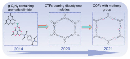 Based on the above result, metal-free photocatalysts have shown significant potential in the field of photocatalytic overall H2O2 production and have become an indispensable component in this field. Although some research on metal-free organic polymer for H2O2 generation has been reported, there is still a lack of related reviews to summarize the photocatalytic overall H2O2 generation of metal-free organic polymer for. Based on this, we will introduce the research process of representative metal-free organic polymer photocatalysts mainly including COFs, CTFs and g-C3N4 in overall H2O2 generation in recent years in the next section.