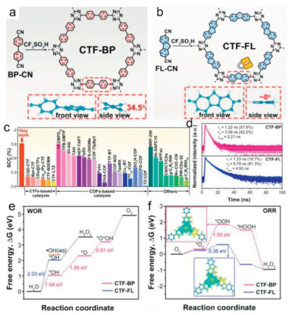 Figure 10 Schematic diagram for synthesizing of (a) CTF-BP and (b) CTF-FL. (c) Comparison of the SCC efficiency for CTF-NSs with the reported representative metal-free photocatalysts; (d) Time-resolved PL spectra of CTF-BP (pink) and CTF-FL (blue); Gibbs free energy diagrams of (e) ORR and (f) WOR steps on CTF-BP and CTF-FL. Copied with permission [37]. Copyright 2024, American Chemical Society.