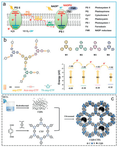 Figure 11 (a) Natural photosynthesis charge separation processes. (b) Schematic illustration of the stepwise charge transfer within the CTFs. Copied with permission [120]. Copyright 2024, American Chemical Society. (c) Scheme of the synthetic route of CQD-CTFs. Copied with permission [55]. Copyright 2024, Wiley-VCH GmbH.