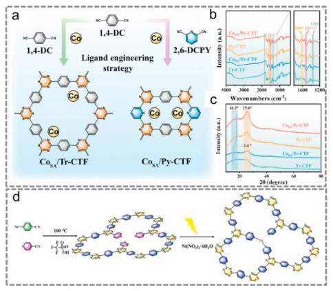 In addition to the reported heterojunction and functionalization strategies, single-atom doped in CTFs for photocatalytic overall H2O2 production has also been extensive studied. Shen's group prepared a high-density Co single-atom-loaded pyridine modified CTF (CoSA/Py-CTF) for photocatalytic overall H2O2 generation (Fig. 12a) [121]. The obtained CoSA/Py-CTF exhibited a remarkable photocatalytic overall H2O2 evolution rate of 2898.3 µmol g−1 h−1 under visible light irradiation with an AQY and SCC up to 13.2% at 420 nm and 0.15% under AM 1.5, respectively, which exceed most metal-free photocatalysts ever reported. The FT-IR and XRD demonstrated the single-atom-loaded CTF was prepared successfully (Figs. 12b and c). This research provides perceptive observations into the intricate dynamic behavior and catalytic mechanism of SACs. After that, Shen's group further study photocatalytic overall H2O2 evolution using Ni single-atom doped CTFs (Fig. 12d) [122]. They found dual-pathway synergistically promoting photocatalytic overall H2O2 evolution by ORR and WOR. Dual active site CTFs loading single-atom Ni and pyridine N (d-CTF-Ni) presented excellent overall H2O2 evolution rate of 869.1 µmol g−1 h−1. This study offers a new insightful on the dual active site catalytic mechanism for photocatalytic overall H2O2 generation.