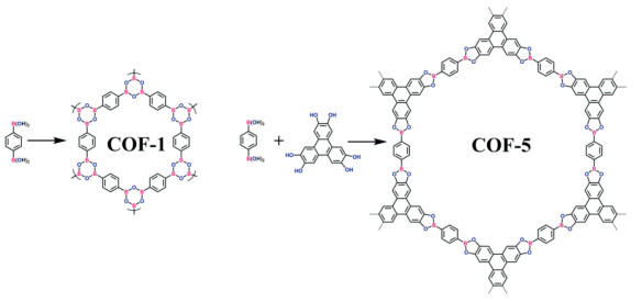 COFs are a classic representative of porous organic polymers with high crystallinity and periodic structures. The COFs usually are synthesized using reversible chemical reactions, such as boroxine, boronate-ester, imide, and imidazole, thus, leading to highly crystallinity [123–125]. In 2005, Yaghi's research group first successfully prepared COF-1 and COF-5 by reversible boronate-ester reaction (Fig. 13) [123]. Over the past few years, the COFs materials with different linkages develop rapidly due to their exactly structural characteristics and great potential in various field, such as energy storage and conversion, separation and photo/electron catalysis (Fig. 14) [126–132]. The COFs with semiconductor characteristics are one of the promising candidate materials for overall H2O2 production due to their large surface area, structural designability, high chemical stability, light weight, extensive π-conjugation, flexible synthetic strategy. The extensive π-conjugation in COFs extended covalent systems promotes the absorbance of visible light. The π-π stacking interaction of framework benefit the migration and transport of carriers, which can prevent the recombination of photo-excited carriers and maximize photocatalytic overall H2O2 production efficiency. The larger surface area can expose abundant active sites and promote contact between water and COFs frameworks. It is the synthesis link-ages modules provide rich options for design production with different photo-electric and physical properties for various application. Given these unique properties, COFs have shown satisfactory employment in photocatalytic overall important that H2O2 production, and many of them have exhibited better performance than inorganic semiconductors [133]. However, the COF's photocatalytic overall H2O2 production was not achieved until 2021, which is far behind other photocatalytic applications such as water splitting, CO2 reduction, and organic degradationc [134–136]. In 2021, Yu's group first reported photocatalytic overall H2O2 production using triphenylbenzene-dimethoxyterephthaldehyde-COF (TPB-DMTP-COF) at gas–liquid–solid interface (Fig. 15a) [134].