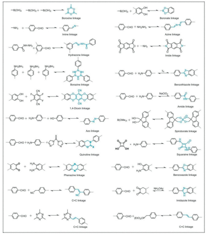 Figure 18 (a) a Schematic of Kf-AQ condensation. Reprinted with permission [153]. Copyright 2024, Springer Nature. (b) The synthetic route of cyanide-functionalized D-A-π-D ECUT-COF-50 and D-A-π-A ECUT-COF-51. Reprinted with permission [154]. Copyright 2025, Elsevier. (c) Chemical structure of TDB-COF. Reprinted with permission [155]. Copyright 2023, Elsevier.