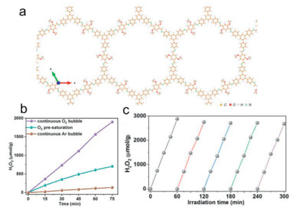 Figure 15 (a) Structure model of TPB-DMTP-COF. (b) Visible light-driven H2O2 production in pure water. (c) Photocatalysis stability testing of TPB-DMTP-COF. Copied with permission [134]. Copyright 2021, Wiley-VCH GmbH.