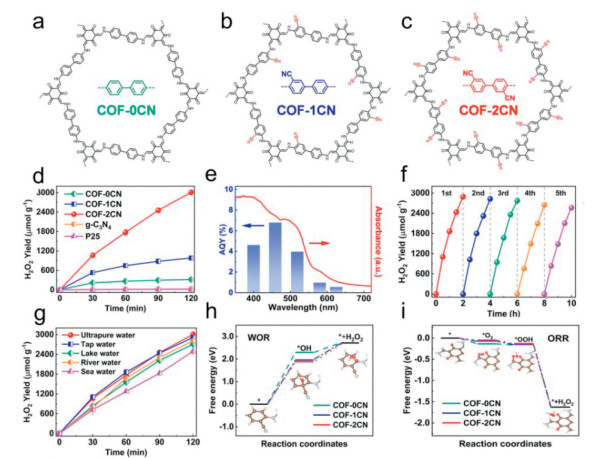 Figure 16 Chemical structure of COF-0CN (a), COF-1CN (b) and COF-2CN (c). (d) Time-dependent H2O2 photogeneration using visible light for fabricated samples. (e) The AQY of COF-2CN at selected wavelength. (f) Long-term testing of COF-2CN for H2O2 photosynthesis. (g) Photocatalytic H2O2 production by COF-2CN in ultrapure water, tap water, river water, lake water and sea water under visible-light irradiation. Calculated energy profile for oxidation of water into H2O2 (h) and reduction of oxygen into H2O2 (i) on three COFs at U = 0 V vs. SHE at pH 7. Copied with permission [151]. Copyright 2024, Wiley-VCH GmbH.