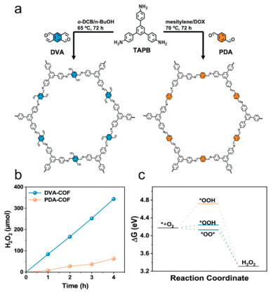 Figure 17 (a) Synthetic routes used to prepare samples. (b) Photocatalytic performance curves over obtained samples. (c) Free energy diagram of ORR pathways for PDA-COF (orange) and DVA-COF (blue). Copied with permission [30]. Copyright 2024, Wiley-VCH GmbH.