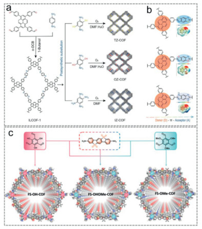 Figure 19. Synthetic routes (a) of TZ-COF, OZ-COF and IZ-COF. (b) D-π-A model and differences of COFs (the inset is the local charge distribution). Copied with permission [143]. Copyright 2023, Wiley-VCH GmbH. (c)The synthetic routes and chemical structures of the different samples. Copied with permission [159]. Copyright 2024, Wiley-VCH GmbH.Figure 20