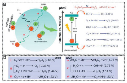 (3) Compared to ORR progress, the WOR reaction requires a higher redox potential to overcome thermodynamics barrier. Therefore, the design and development of new metal-free photocatalysts with sufficient thermodynamic driving force is crucial for achieving efficient overall H2O2 production. Various strategies have been reported for regulating the WOR thermodynamic driving force in metal-free photocatalysts, including single-atom doped, introducing acetylene and leveraging topological effects. Among them, most methods primarily focus on direct 2e− WOR, which is thermodynamically more favorable than 1 e− WOR. However, the 1e− WOR exhibits superior kinetics compared to the 2e− WOR due to the larger potential difference between the reaction and photo-excited holes. Additionally, on the oxidation side, the 1e− WOR can release more protons from H2O, significantly enhancing the hydrogenation rate during the 2e− ORR process. Therefore, a promising strategy for achieving highly efficient photocatalytic overall H2O2 generation is the development of new metal-free photocatalysts with an efficient 1e⁻ WOR capability. Here we could study carefully the effective strategy from electrocatalysis and thermal catalysis to improve the WOR thermodynamic driving force of photoctalysis.