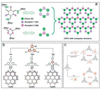 Figure 20 The schematic illustration of the octupolar structure in different samples. Copied with permission [43]. Copyright 2023, Springer Nature. (b) Synthesis of TpaBtt, TapbBtt and TaptBtt. Copied with permission [137]. Copyright 2024, Springer Nature. (c) Synthetic routes of TBTN—COF and TMT-COF. Copied with permission [140]. Copyright 2024, Wiley-VCH GmbH.
