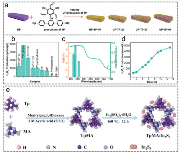 Figure 21 (a) Schematic illustration the synthesis process of the UP-TP. (b) Photocatalytic overall H2O2 generation of various photocatalysts. (c) Wavelength-dependent AQE of H2O2 generation over UP-TP and the corresponding DRS spectrum. (d) Continuous H2O2 production over long-time testing. Copied with permission [164]. Copyright 2024, Wiley-VCH GmbH. (e) Schematic illustration of the synthesis process for TpMA/In2S3. Copied with permission [104]. Copyright 2024, Elsevier.