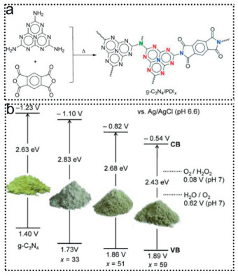 Figure 3 (a) Synthesis process for g-C3N4/PDIx. (b) Electronic band structures of g-C3N4 and g-C3N4/PDIx. Copied with permission [83]. Copyright 2014, Wiley-VCH Verlag GmbH & Co. KGaA, Weinheim.
