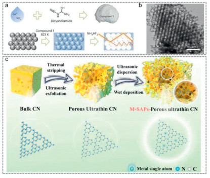 In situ DRIFTS spectra confirmed the presence of *OOH intermediates, validating the dominant 2e− ORR pathway. However, the sluggish water oxidation kinetics (4e− WOR) limits the overall efficiency, suggesting the need for cocatalysts to improve O2 evolution. The synthetic process of CNIO-GaSA was shown in Fig. 4a. It was prepared by combining Ga(NO3)3 and dicyandiamide as the precursor and silica opal as template with subsequent removal strategies. Partial density of states (PDOS) reveals the formation hybridized Ga 4p and N 2p states could enhance the conductivity of CN contribute to reduce the transfer resistance of charge carriers. The transmission electron microscopy (TEM) (Fig. 4b) image show that obtained CNIO-GaSA has the periodic pore structure with an average diameter of ~250 nm. CNIO-GaSA presents a significantly enhanced H2O2 production rate (368.5 µmol/h), which is about 4.0 and 7.8 times, respectively higher than that of CNIO and CN. In addition, CNIO-GaSA exhibits the highest catalytic activity compare to other previously reported photocatalysts. Significantly, CNIO-GaSA also shows the excellent 100% efficiency for kill bacteria, thereby offering promising potential practical application. Although the CNIO-GaSA shows excellent photocatalytic activity toward overall H2O2 generation, the Ga is rare metals, which is not fit for practical application. On this basis, Zhang's group reported a high-loading Ni single-atom photocatalyst for efficient overall H2O2 synthesis with an AQY and solar-to-chemical conversion (SCC) up to 10.9% and 0.82%, respectively (Fig. 4c) [90].