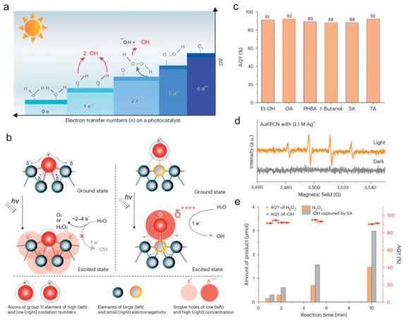 Figure 5 (a) Schematic diagram showing the intermediates in the multielectron-transfer processes of WOR. (b) Excited properties of group 11 elements at different chemical states. (c) Average AQY of AuKPCN for photocatalytic H2O2 with different sacrificial agent. (d) ESR spectra of AuKPCN recorded in 0.1 mol/L AgNO3 solution. (e) Generation amount of ·OH and H2O2 in SA with saturated O2. Copied with permission [102]. Copyright 2024, Springer Nature.