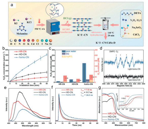Figure 6 (a) Schematic diagram of the synthesis K+/I−-CN/CdSe-D. Copied with permission [94]. Copyright 2024, Wiley-VCH GmbH. (b) The H2O2 yield of HR-CN, HD-CN and homo-CN. (c) H2O2 yield of obtained samples under different conditions. (d) EPR signal of DMPO •O2- of homo-CN. (e) Steady-state photoluminescence spectra and (f) fluorescence lifetime decay curves. (g) UV–vis DRS and energy band gap plots. Copied with permission [92]. Copyright 2023, Elsevier.