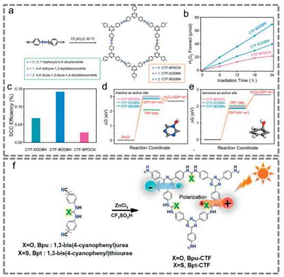 Figure 9 (a) Scheme of the synthesis of samples from their precursors. (b) Typical time course of H2O2 production using different samples. (c) The SCC efficiencies measured under simulated AM1.5 G. Calculated free energy different active sites: (d) Triazine structure in all CTFs, (e) benzene group in all CTFs. Copied with permission [30]. Copyright 2019, Wiley-VCH GmbH. (f) Rational synthesis of samples with different charge separation and transfer ability. Copied with permission [119]. Copyright 2022, Wiley-VCH GmbH.