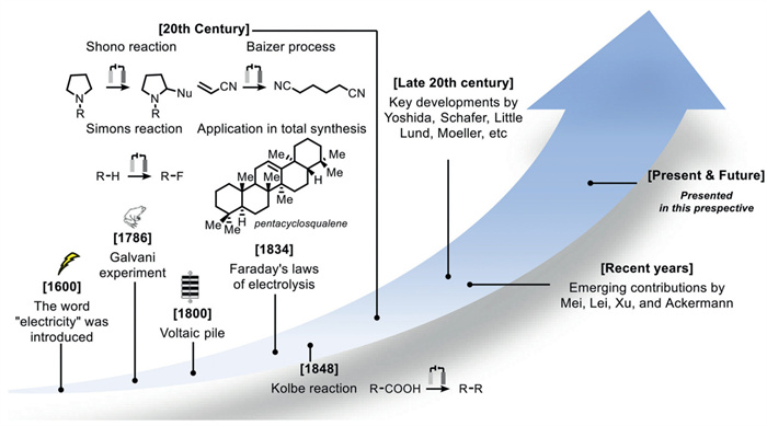 The term "electricus" was first cioned by William Gilbert in his 1600 work "On Magnetism" (Fig. 1). In 1786, Luigi Galvani performed the first electrochemical experiment on frog legs, but later Alessandro Volt refuted this research explanation while developing the first battery model - the Volta stack [1]. In 1834, Michael Faraday defined the main laws of electrolysis [2], and Hermann Kolbe conducted and analyzed the first organic electrosynthesis in 1848 [3], which set the stage for experimental scientists to introduce electricity into kinetic chemical reactions. Electrochemical technology enabled scientists such as Henry Moissan [4] and Humphrey Davy [5] to discover new elements such as Li, Na, and F, which were difficult or even impossible to obtain using chemical reagents at the time (Fig. 2). In the following century, electrosynthesis has undergone tremendous development (Fig. 1). Therefore, various challenging reactions have been achieved, ranging from industrial processes such as the Monsanto adiponitrile process developed by Professor Manuel Baizer in the United States [6], to basic conversion and total synthesis applications including Shono oxidation [7], electrofluorination [8,9].