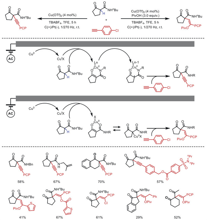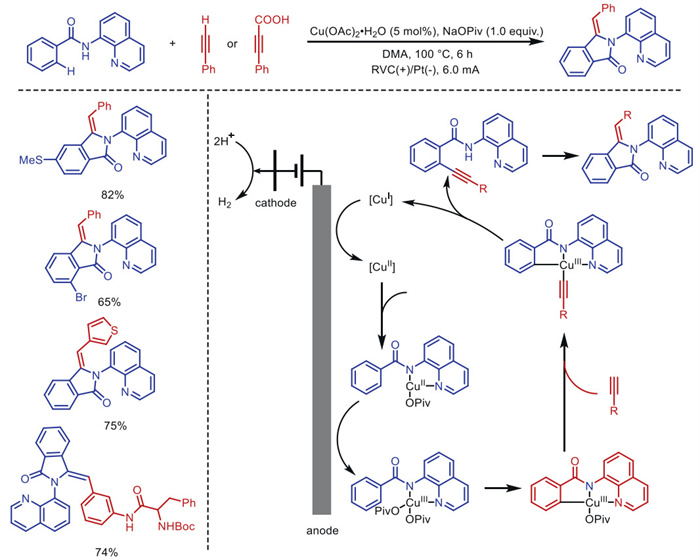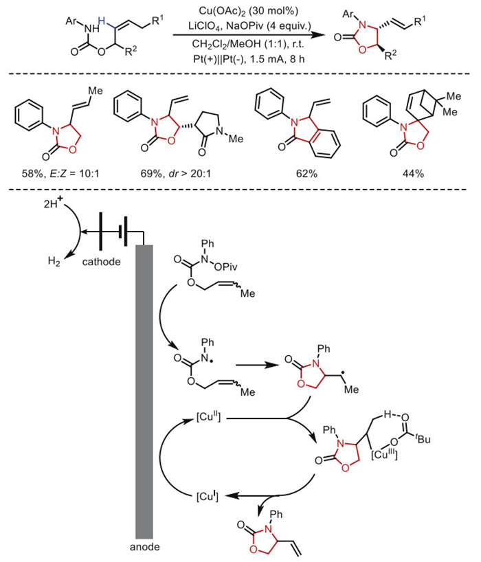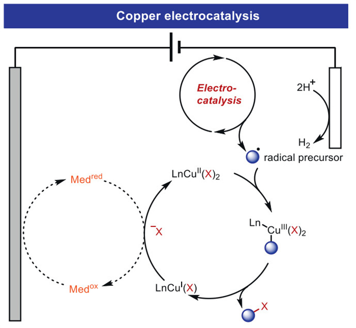 In most cases, direct oxidation at the anode or the addition of redox media achieve the CuⅠ/CuⅡ/CuⅢ catalytic cycle. The radical precursors generate radicals in addition to olefins through direct electrolysis, photoelectrocatalysis, HAT and other pathways to achieve difunctionalization of olefins. Distinguishing from the traditional coupling mode of C(sp2)–H bond activation, C(sp3)–H tends to generate carbon radicals, followed by oxidative addition to [CuⅡ] and reductive elimination to obtain the products. The C–C bond activation substrate is limited to carboxylic acids, which can generate carbon radicals via the LMCT pathway. In fact, there are still relatively few cases of C–C bond activation and C–X bond activation.