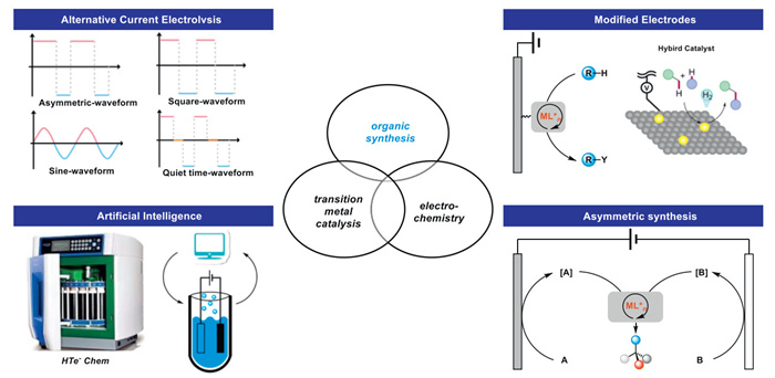 In a typical electrolysis process, substrates typically gain or lose electrons at the cathode or anode, and produce highly reactive free radical intermediates, making control of the chemistry, regioselectivity and enantioselectivity very challenging. Due to the rich and controllable valence states of transition metals, the combination of electrochemistry and metal catalysts has always been a hot research topic in the field of organic synthesis [30-32]. Electron transfer on electrodes can generate catalysts with more valence states [33]. The synthetic organometallic electrochemistry can be mainly divided into several reaction modes: oxidation, reduction, paired electrolysis, and asymmetric catalysis (Fig. 4). Compared with other catalysts, transition metals are attractive because: (1) The reactions catalyzed by transition metals are universal for electrochemical synthesis, with adjustable current and potential; (2) The redox potential of transition metal catalysts can be regulated through ligand modification; (3) The chemical, regional, and stereoselectivity can be determined by transition metal catalysts.