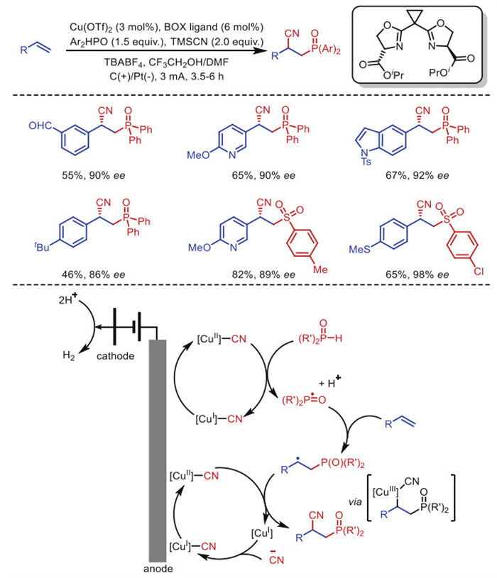 In 2019, Lin's group [38] developed a unique electrochemical copper-catalyzed approach for the highly enantioselective cyanation of vinyl aromatics in the asymmetric radical functionalization of olefins (Scheme 1). Two concurrent single electron transfer (SET) cycles between the anode and the metal are carefully combined to achieve in-situ formation of radical intermediates, which are ultimately captured by copper metal to achieve the desired production pathway. In the case of the cyanophosphorylation reaction, for example, the envisioned mechanism involves the parallel electrochemical generation of transient phosphonyl radicals and persistent [CuⅡ]–CN complexes provide CN•, and the subsequent reaction of these open-shell intermediates with olefin completes the difunctionalization.