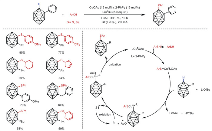 Carboranes are polyhedral molecular boron-carbon clusters with unique properties such as high boron content, icosahedral geometry, and three-dimensional electron delocalization [57]. These features render carboranes valuable building blocks for optoelectronic applications [58]. In 2021, Ackermann's group [59] achieved sustainable copper-catalyzed electrochemical C–H chalcogenation of o-carboranes with thiols and selenols at room temperature (Scheme 11). The C–H activation features mild reaction conditions and high functional group tolerance, enabling facile assembly of diverse o-carboranes. This establishes a transformative platform for the design of cage C–S and C–Se o-carboranes. Through detailed mechanistic studies, a plausible paired electrolysis mechanism was proposed.
