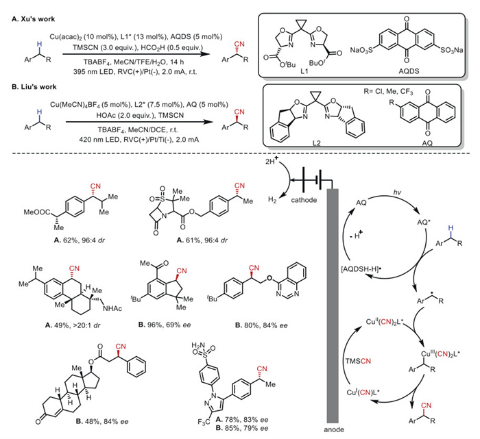 Asymmetric C(sp3)–H functionalization has been demonstrated to significantly streamline the late-stage modification of complex molecules [60-62]. In 2022, both Xu's group [63] and Liu's group [64] independently reported the first photoelectroasymmetric functionalization of C(sp3)–H bonds (Scheme 12). The asymmetric photoelectrocatalytic cyanation reaction employs a combination of copper catalyst and photocatalyst, featuring a broad substrate scope without the use of chemical oxidants. A series of late-stage cyanations of complex structures were achieved with excellent yields and high site and enantioselectivity. Mechanistic studies reveal that the photocatalyst AQDS forms an electronically excited state AQDS* under near-infrared irradiation, which undergoes single-electron oxidation to generate a benzyl radical. The benzyl radical then coordinates with the chiral copper complex (L*)CuⅡ(CN)2, followed by reductive elimination to release the desired cyanated product. The reduced intermediates (L*)CuⅠ(CN) and (AQDS−H)• are anodically oxidized to regenerate (L*)CuⅡ(CN)2 and AQDS, concomitantly releasing hydrogen gas. The integration of photoelectrocatalysis and asymmetric copper-catalyzed radical cyanation [35] enables modular control over diverse C–H functionalization processes via radical relay catalysis.