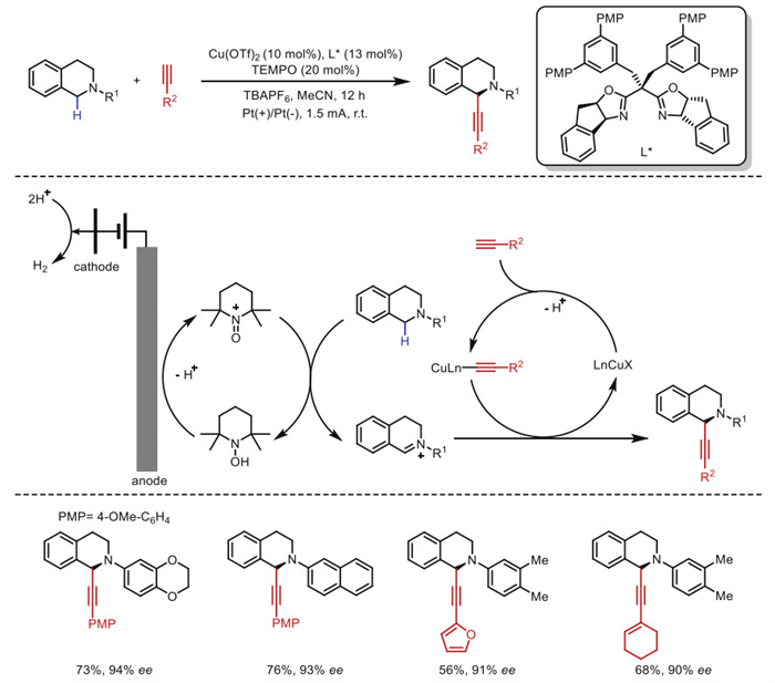 This approach afforded C1-alkynylated tetrahydroisoquinolines with good to excellent enantioselectivity. The use of TEMPO as a cocatalytic redox mediator was critical not only for oxidizing tetrahydroisoquinolines to iminium species but also for lowering the reaction's oxidation potential.