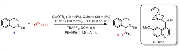 In 2023, Mei's group [66] developed a C(sp3)–H alkenylation method for N-aryl tetrahydroisoquinolines (THIQs) by replacing alkynes with enals (Scheme 14). This strategy employs TEMPO as the mediator and quinine as the catalyst ligand.