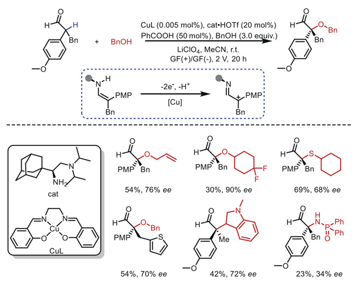 Although electrochemical copper-catalyzed has made considerable progress in recent years, this field still faces many challenges. A major challenge of electrochemical copper catalysis lies in the fact that copper ions have a low standard reduction potential and are sensitive to the electroreduction environment, leading to catalyst deactivation. Most copper-catalyzed electrochemical reactions are focused on oxidation at the anode, while reduction reactions or more efficient pairwise electrolysis reactions are still in the preliminary exploration stage; Enantioselective electrocatalysis is an emerging trend in asymmetric synthesis under very mild reaction conditions. Asymmetric electrochemical copper catalysis is an atomically efficient way to obtain α-aryl chiral cyanide. The unique stereocontrol of benzyl radicals may stem from attractive noncovalent interactions between benzyl radicals and copper ligands, which will determine the geometry of the transition state. In the future, the problem of stereoselective control of unstable alkyl radicals should be vigorously solved by designing new chiral ligands; The main types of electrocopper catalysis are functionalization of olefins and activation of C–H bonds. The activation of C–C bonds is also limited to benzylcarboxylic acids, and the development of more reaction types of electrochemical copper catalysis is the future development trend; Meanwhile, the acquisition of other chiral compounds through other radical precursors deserves special attention.