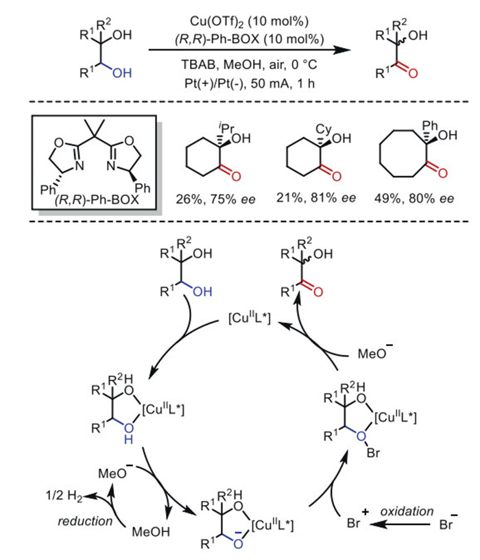 In the proposed catalytic cycle, the complex formed by the diol and [CuⅡ]L* is readily deprotonated by methoxide ions generated at the cathode, producing an alkoxide anion. This anion then reacts with Br⁺ species formed at the anode to generate a complex intermediate. Following the release of HBr, the optically active α-ketol is obtained, and the chiral copper catalyst is regenerated.