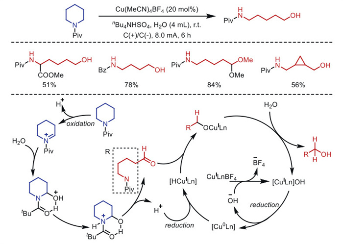 In 2024, Ruan's group [82] developed a mild and biocompatible paired electrolysis ring-opening strategy, utilizing copper electrocatalysis to synthesize various remote amino alcohols, including unnatural peptide alcohols (Scheme 19). Experimental results and density functional theory (DFT) calculations indicate that water serves as both a hydroxyl source and a solvent, facilitating the generation of CuH and CuⅠ at the cathode, thereby reducing the aldehyde intermediates formed during the reaction.