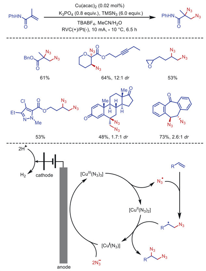 The successful development of enantioselective electrocatalysis further demonstrates the robustness of the electrocatalytic strategy as a potentially versatile mechanistic platform for the critical difunctionalization of simple olefins. In 2022, Xu's group [40] reported a scalable copper electrocatalytic diazotization reaction of olefins, in which 0.02 mol% copper acetylacetonate was used as a precatalyst without exogenous ligands (Scheme 2). In addition to using low catalyst loading, this electrocatalytic method is scalable and compatible with a wide range of functional groups for the diazotization of α, β-unsaturated carbonyl compounds as well as mono-, di-, tri- and tetra-substituted unactivated olefins.