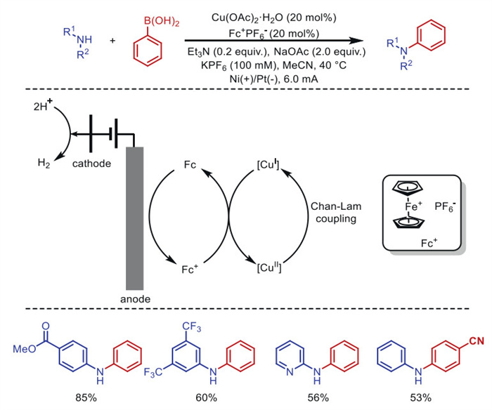 In 2021, Sevov and co-workers [83] reported a ligand-free copper salt catalysis for the electrochemical homogeneous Chan-Lam coupling reaction between amines and arylboronic acids, using Cu(OAc)2 as the catalyst and Fc⁺ as the anodic mediator, affording anilines in moderate to excellent yields (Scheme 20). The ferrocenium catalyst serves multiple functions: (1) It mediates the CuⅠ/CuⅡ cycle in the coupling reaction; (2) It protects the amine from anodic oxidation; (3) It regenerates CuⅡ from Cu0 deposited on the cathode surface.