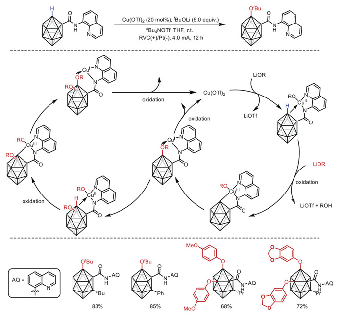 In 2020, Xie and co-workers [84] reported the first copper-catalyzed electrochemical B–H oxidation reaction of o-carborane by introducing 8-aminoquinoline as a directing group at room temperature (Scheme 21). Copper-catalyzed cross-coupling of carborane amides with lithium phenoxide led to the formation of 4,5-diphenol o-carborane via direct B–H activation, whereas the use of lithium tert–butoxide afforded the 4-monooxidation product. This reaction required no additional chemical oxidants and produced H2 and lithium salts as byproducts. Control experiments suggested that high-valent CuⅢ species might be involved in the reaction process. This study combines cheap metal catalysis with electrochemistry, opening up new avenues for the synthetic chemistry of carboranes and other boron clusters.