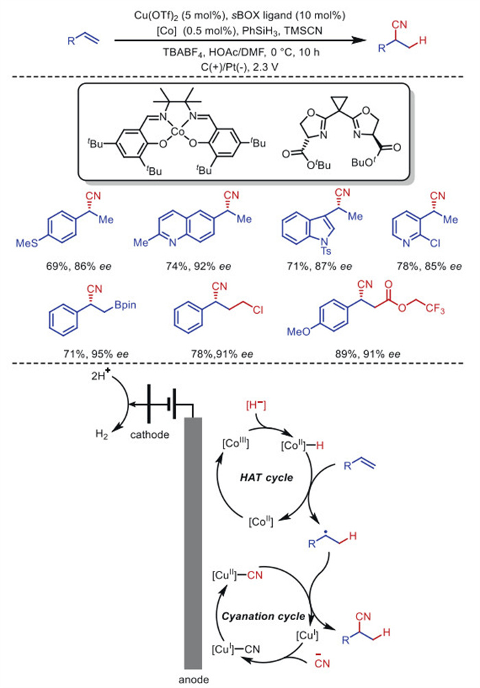 In 2020, Lin's group [51] ingeniously combined metal hydride hydrogen atom transfer catalysis with [CoⅢ]–salen and Cu (sBOX) to realize asymmetric radical hydrocyanation in an electrochemical environment (Scheme 5). Both redox-metal cycles are driven by anodic oxidation, converting H• and CN• addition to double bonds, respectively, with required electrode potentials as low as 0.2 V. This mild condition allows an unprecedented range of substrates to tolerate functional groups that are typically unstable under oxidative stress, such as nitrogen heterocycles, electron-rich aromatics, sulfides, and aldehydes, which are incompatible with chemical oxidation methods. From a synthetic perspective, this method is still limited to conjugated olefins, including alkenyl aromatics, dienes, and alkynes. Due to the versatility of its synthesis, it is necessary to extend it to include non-conjugated olefins.