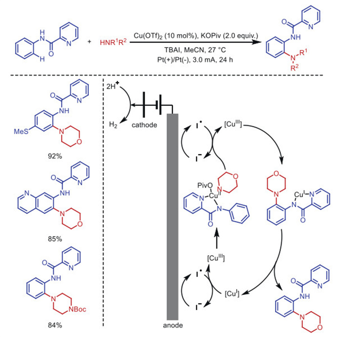In 2018, Mei's group [52] developed an innovative electrochemical method to achieve cross-coupling between C(sp2)–H bonds in N-phenylpiperidinamide compounds and secondary amines, using copper as a catalyst (Scheme 6). This approach relies on iodide to facilitate a copper redox cycle (CuⅢ/CuⅡ/CuⅠ) that proceeds under relatively mild, low-voltage conditions. The key high-valent CuⅢ species enables efficient C–H amination at room temperature. Meanwhile, the reduction of the CuⅠ–substrate complex at the cathode, though less favorable than hydrogen evolution, given its reduction potential (Ered = –0.44 V vs. SHE), is effectively managed within this system. A notable advantage of employing iodide is that it overcomes diffusion-related challenges and reduces the need for costly copper catalysts: only a small amount of inexpensive iodide is required to keep the reaction going.
