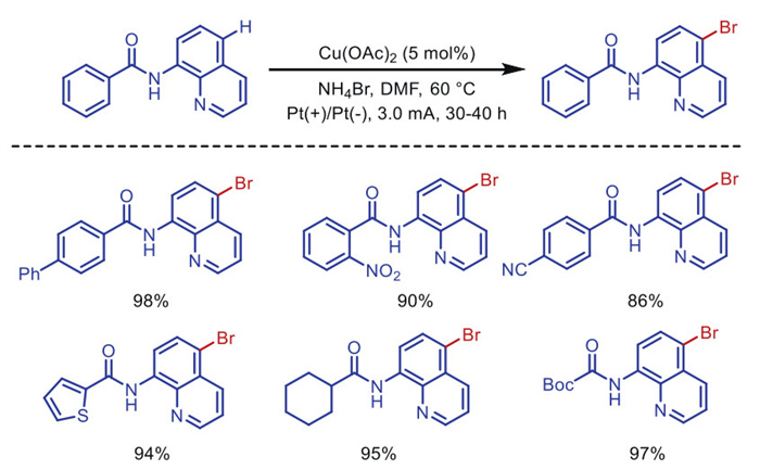 In 2020, Mei's group [55] also reported the application of this chelating directing group in copper-catalyzed electrochemical bromination, using NH4Br as the bromine source to achieve anodic dibromination at the quinoline C5 position (Scheme 9). The catalyst accelerates the bromination reaction through the formation of [CuⅠ] species.